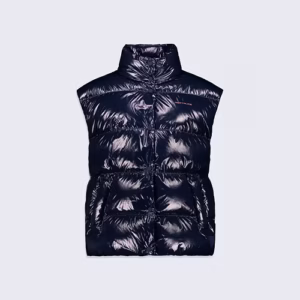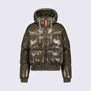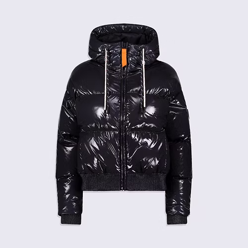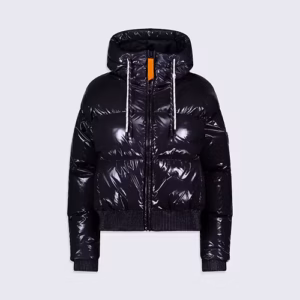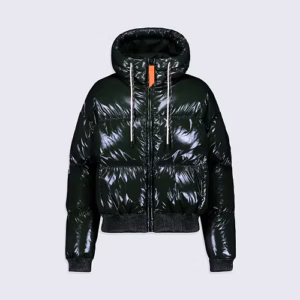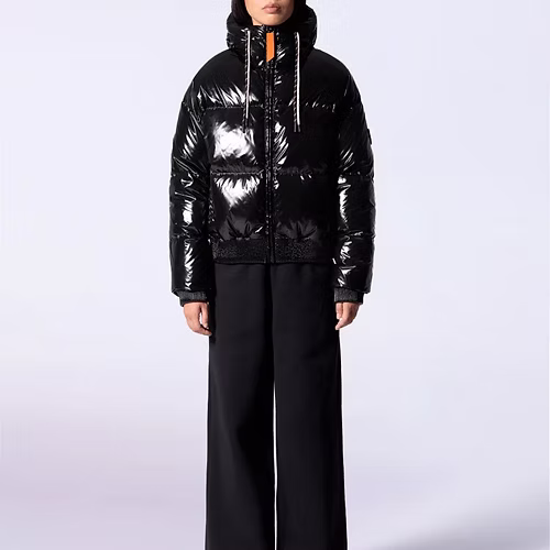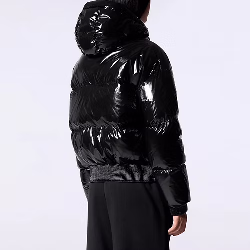 NINE est une doudoune courte à capuche confectionnée en matière brillante. Les manches tombantes et le bas de vêtement sont élastiqués. La capuche est ajustable grâce à un cordon technique. L’ouverture milieu devant se fait par un zip en plastique injecté rehaussé d’une tirette contrastée. Deux poches sont insérées sur le devant. Le patch en silicone ton sur ton iconique de la marque est apposé sur l’épaule.