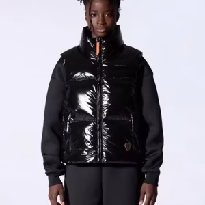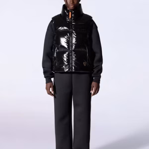 GALILEE est une doudoune sans manche à gros boudins, col montant, volume puffy confectionnée en matière brillante. Une capuche est cachée dans le col. L’ouverture milieu devant se fait par un zip en plastique injecté doté d’une tirette contrastée. Deux poches latérales sont insérées dans la découpe devant. Le logo de la marque est imprimé sur la poitrine. Le patch en silicone iconique ton sur ton est cousu sur le bas devant.